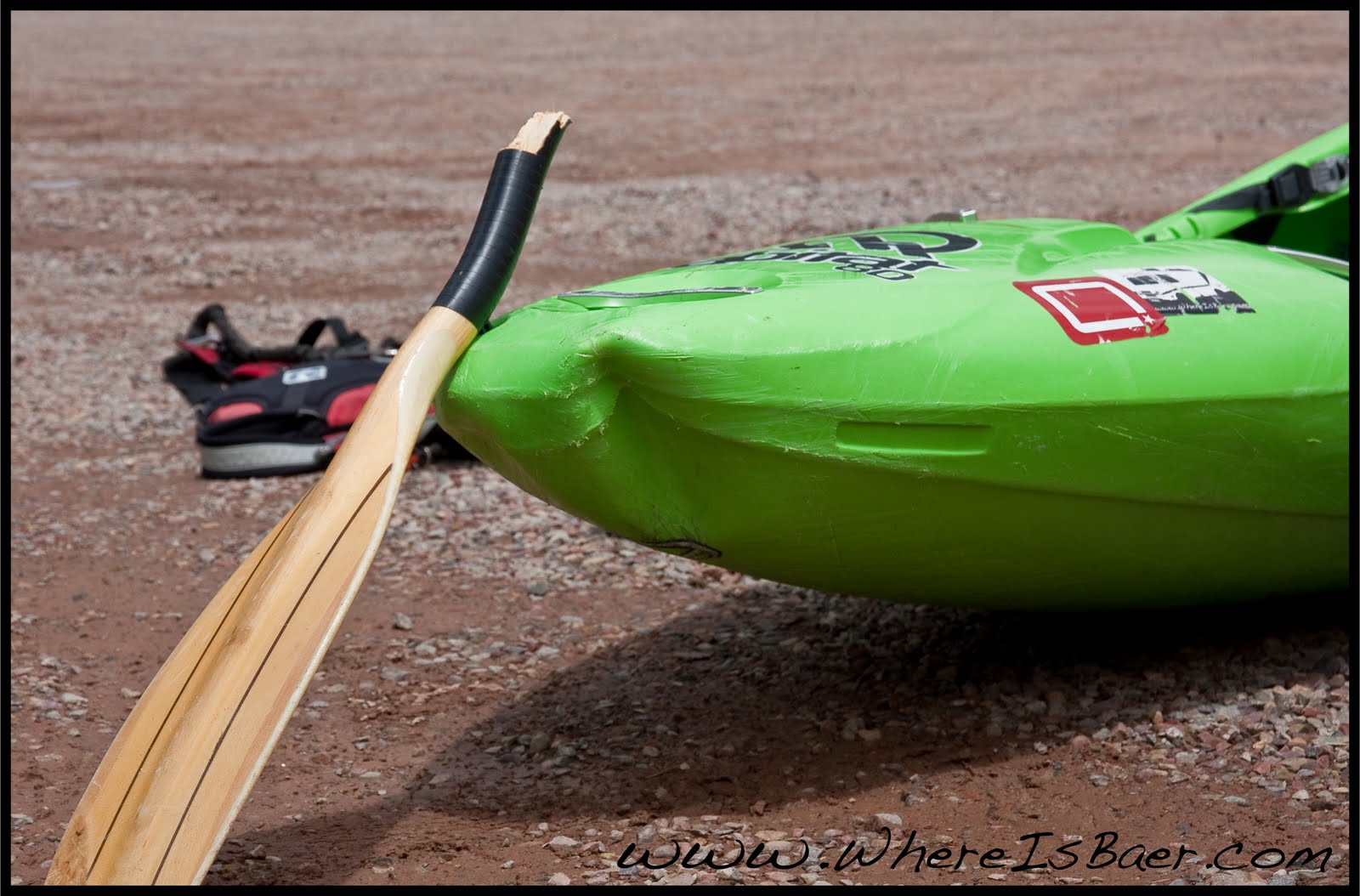 Now it is my turn. I peel out, move right to left, and moving through the crack drop a boil off the wall grabs my boat and flips me upside down, opposite of the side I was bracing on, right into the rock wall. I quickly swing for a rodeo roll and miss. I start to set up for another roll and felt my paddle wedge between the walls. After a quick jerk it comes loose. Setting the paddle back up for another attempt it snags again, and this time it makes that horrible sound: KABOOM. I grab the longer piece of the paddle and try two more rolls to no avail.