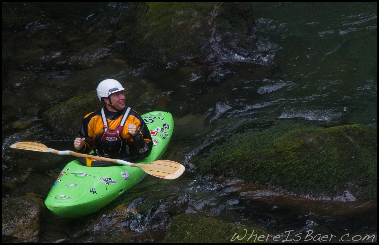 I hopped in my boat, checked my life jacket, helmet, spray skirt, did my supper quick stretch routine, and gave Ferdinand a loud whistle blast. A couple seconds later I heard Ferdinand whistle back, (safety and cameras were ready). I looked down at the shaft of my custom Blunt Family Paddle, and right there in the middle are the words “FIRE IT UP!!!”. I gave the paddle a quick nod as to agree. I paddled back to the middle of the pool, rolled my neck, shrugged my shoulders, and started humming the song again. Out loud I reminded my self to just float over the first drop. I paddled to the slot with a nice right hand angle, and as I came through the slot I picked up a ton of speed. I was flying toward the first 8 footer, leaned forward and rolled over the first drop. A nano second later I got a quick left sweep stroke and the nose of the boat up on the curler. I followed it with a quick right stroke and was blinded by the spray of the curler, about then I felt gravity kick in. I got my left paddle blade ready for a brace and before I knew it I cleared the curler and was a foot away from the lip of the 40 footer. I didn’t even get a chance for a stoke off the 40 footer, I did push my weight forward and cleared my paddle to one side. A half of a second of free fall and I entered the landing zone. I glanced off a rock about 9 feet under the surface and paddled away from the drop with a huge smile.