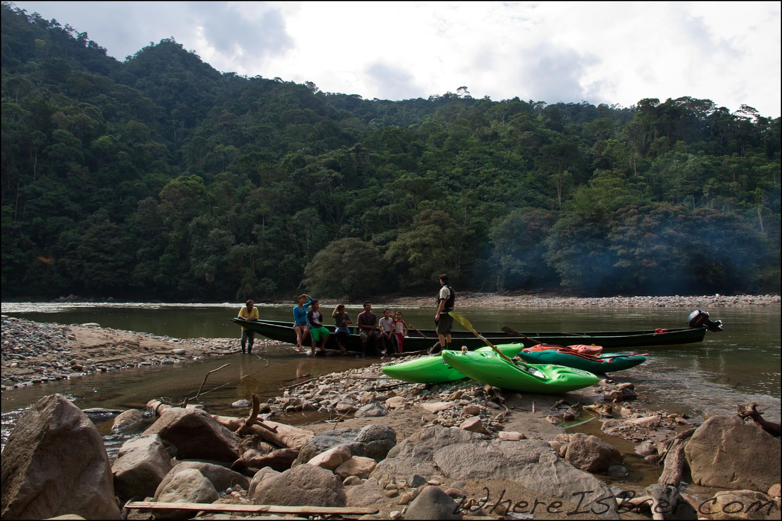 The section of white water leading to the confluence was filled with conglomerate sieves. After passing a very marginal water quality tributary we found ourselves very slowly portaging our way down the river right side of the creek. We climbed over large boulders, through the jungle, all the while surrounded by garbage and sewage from the up stream community.