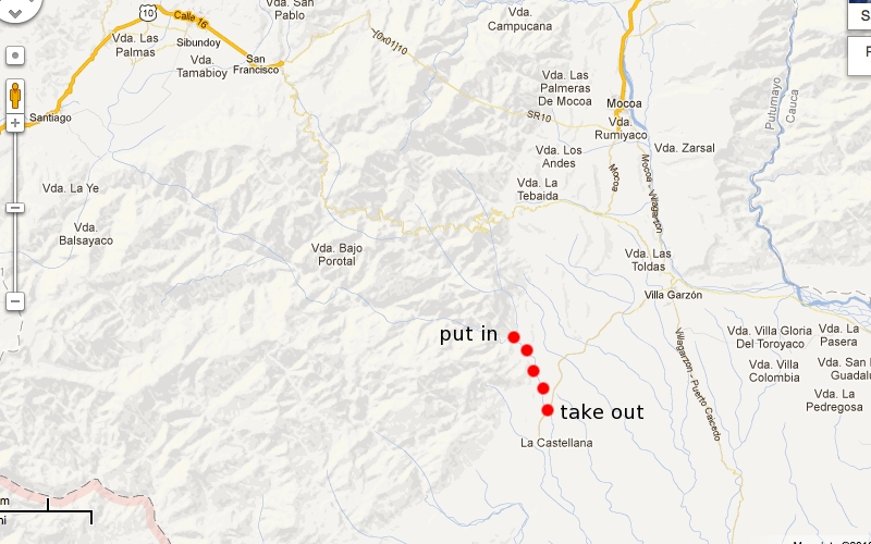 Just South of the city of Mocoa, is Hostel Casa del Rio. I would strongly suggest basing here while paddling in the region. On a casual day you can truly walk across the street and put your boat in the local swimming hole, the Rio Rumiyaco. Paddle down and enjoy the local swimming hole culture for about a mile, and then confluence with the Rio Mocoa.